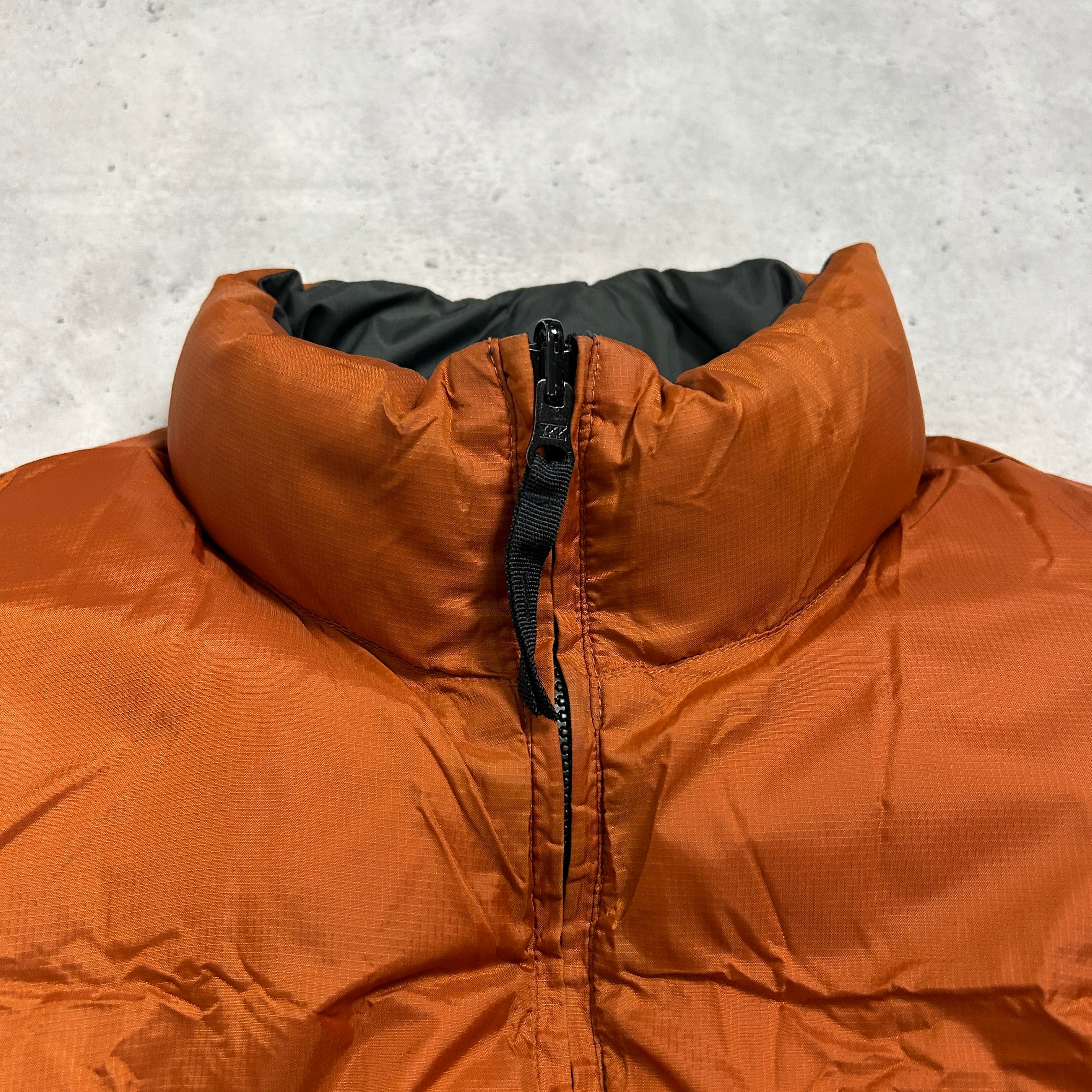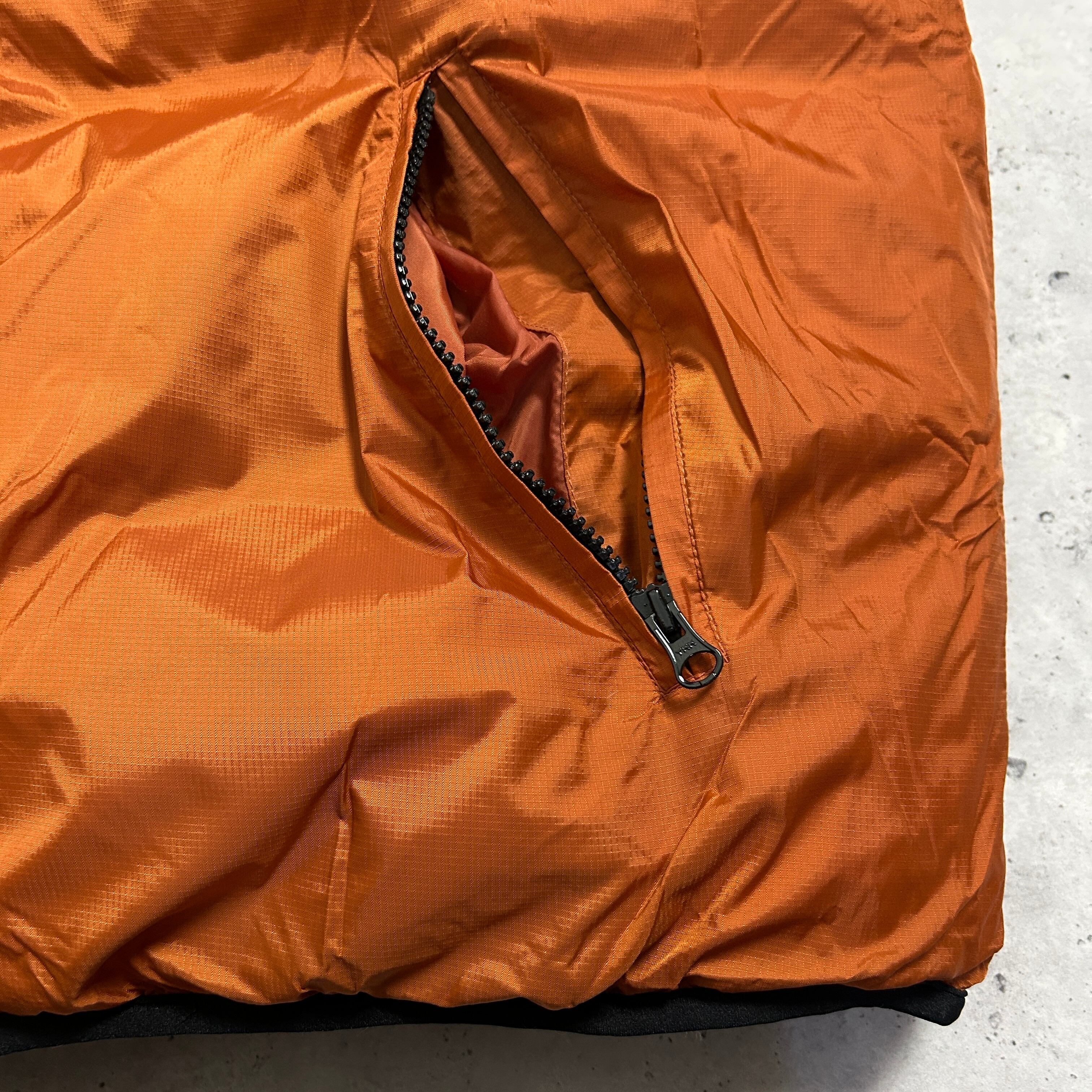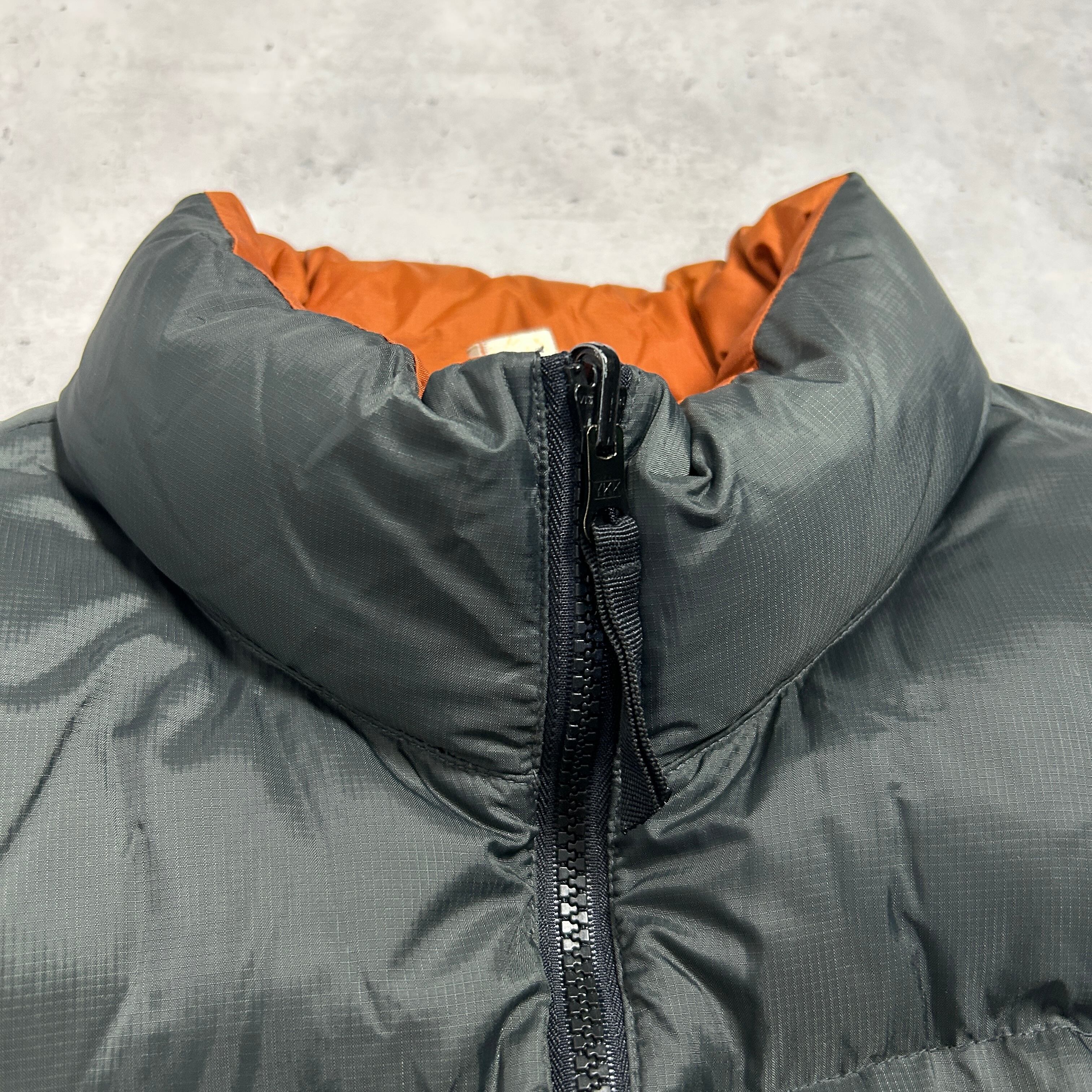 シャイニーなグレーとオレンジがリバーシブルになったダウンベスト